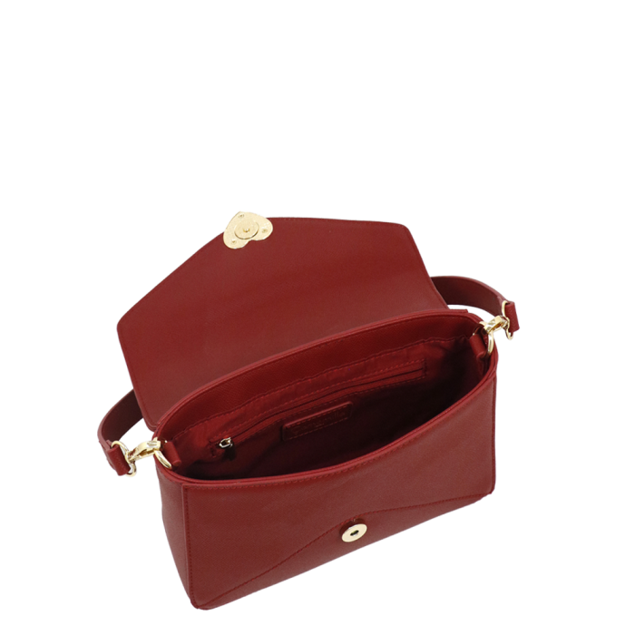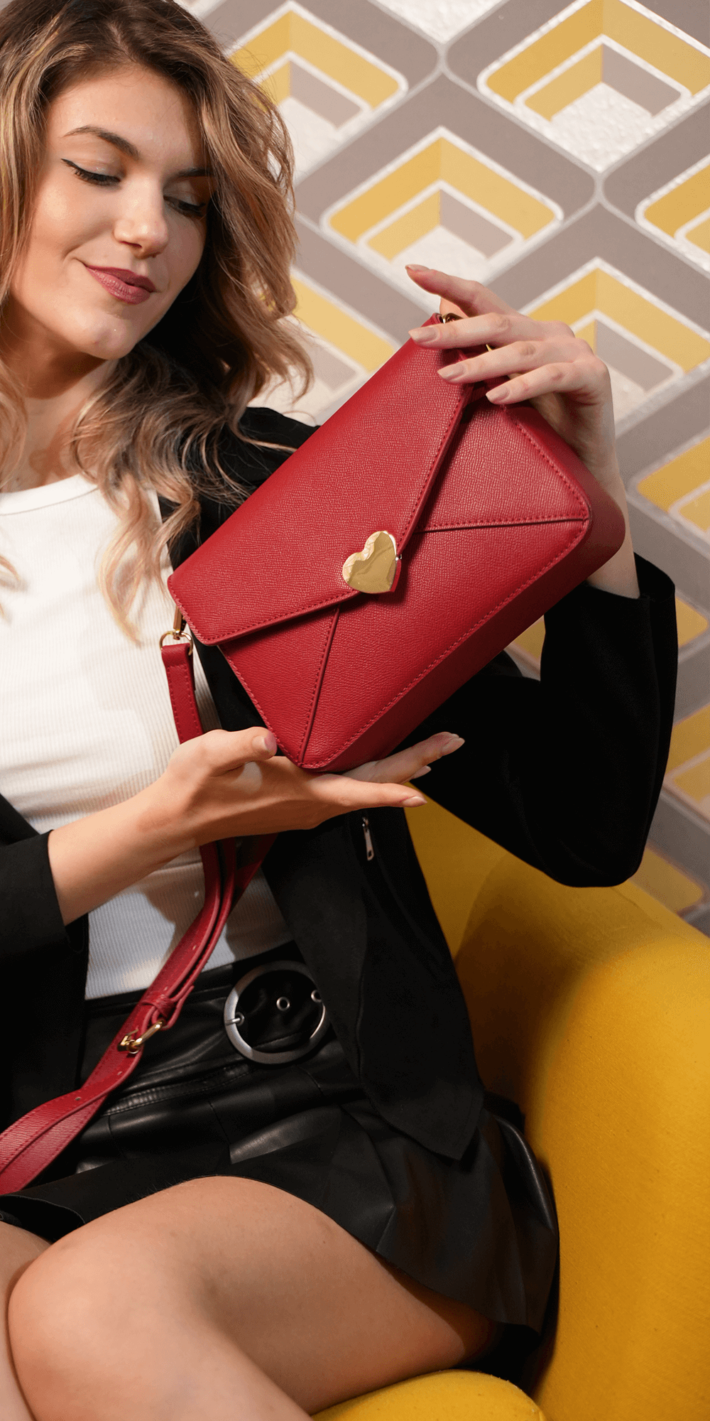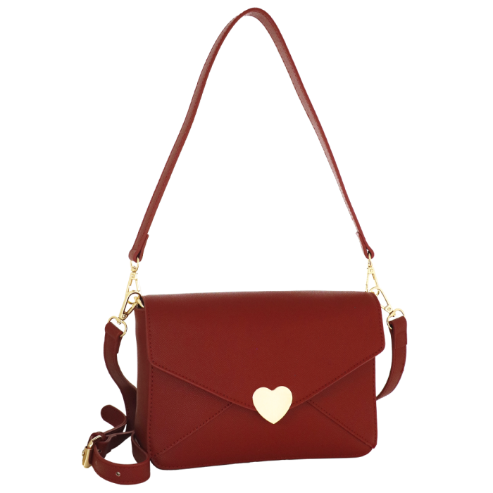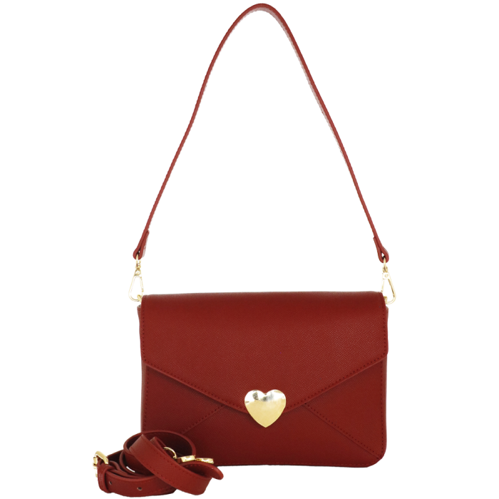 BORSA A SPALLA NINA con doppia tracolla. Una lunga da abbinare a un look casual e una corta per essere più elegante e di tendenza. Un cuore per dedicarsi un messaggio speciale, per regalarsi un momento di tenerezza e per vivere la giornata con un tocco di romanticismo. Perché a volte basta solo un cuore per essere felici. Da questa ispirazione nasce Nina, una borsa a tracolla in pelle sintetica con portafoglio coordinato, disponibile in quattro tonalità: rosso, rosa, taupe e nero. Il design, che richiama una busta da lettera, è impreziosito da una chiusura a forma di cuore in metallo lucido. Un vero e proprio messaggio d’amore… per completare un look perfettamente romantico.