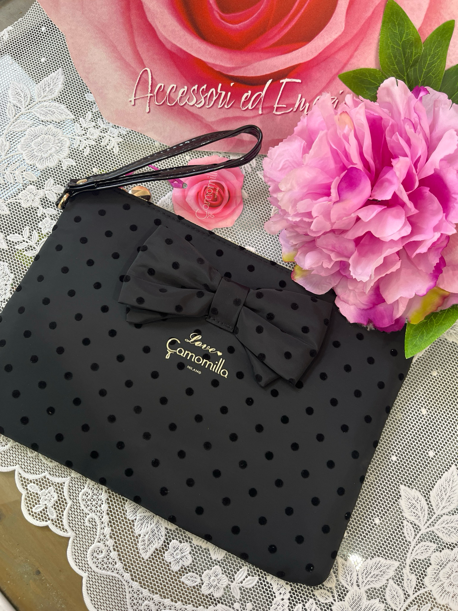 BUSTA PIATTA L POLKA GLAM  utile non solo come porta documenti, ma può tranquillamente essere usata anche come pochette da sera o per un aperitivo. Con un comodissimo laccetto da polso, potrai brindare con un calice di champagne ed avere le mani libere. Una linea sofisticata, realizzata in materiale tecnico effetto satin, impreziosito da una pioggia di delicati pois ton sur ton. Polka glam incarna perfettamente lo spirito romantico e femminile tipico di Camomilla Milano, con un tocco moderno che la rende versatile e contemporanea. Le pochette e i beauty case della collezione sono eleganti e funzionali, arricchiti da un raffinato fiocco che aggiunge un tocco di romanticismo. Una linea pensata per chi cerca praticità senza rinunciare allo stile, ideale per accompagnarti in ogni occasione con un’eleganza.