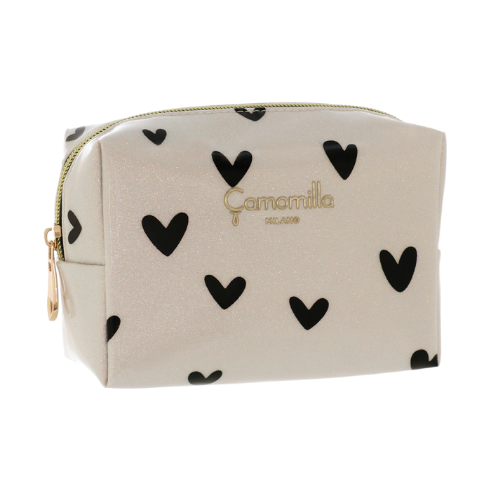 NECESSAIRE M LOVE ME di capienza media, comodo come trousse trucchi. Love Me è una collezione che colpisce dritto al cuore con la sua carica di energia e vivacità. Immagina un’esplosione di cuori rossi su una base glitterata dorata: una linea di beauty case e pochette che riesce a mettere di buon umore al primo sguardo. È impossibile resistere a questa ondata di allegria! Non c’è modo migliore di iniziare la giornata se non con un grande sorriso, e il tuo rituale di skincare mattutino diventa subito speciale. Ma Love Me non si ferma qui. Per chi preferisce una variante più delicata, c’è una seconda versione della linea, caratterizzata da cuori neri che si stagliano su una base glitterata bianca. Una vera e propria esplosione di dolcezza e raffinatezza che rende ogni dettaglio unico. La collezione è sviluppata in diversi formati, pensati per rispondere a ogni esigenza: dalle pochette pratiche e versatili, ideali da tenere in bagno o da portare sempre con te per un ritocco dell’ultimo minuto, ai beauty case di vari formati, tutti eleganti e funzionali.