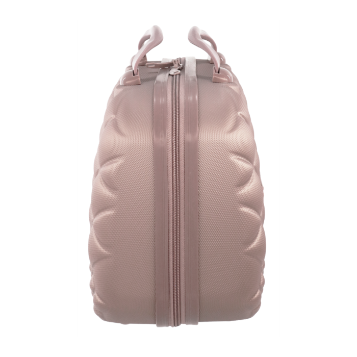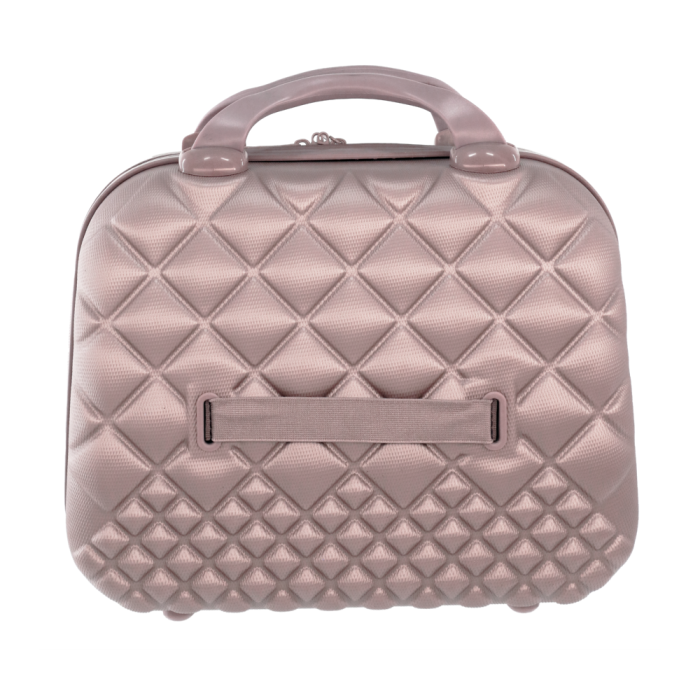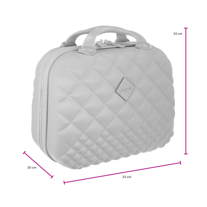 Beauty viaggio rigido effetto matelassé. Capacità 12lt. Particolari: 2 manici in morbida gomma, dettagli in plastica dura in tono con il corpo del beauty composto per il 99 di ABS e per l’1 di policarbonato. Fodera interna corredata di tasca con elastici. La fascia elastica esterna lo rende applicabile sul manico telescopico di qualsiasi trolley. Logo Camomilla Milano apposto su lato frontale. Accettato come bagaglio a mano da tutte le maggiori compagnie aeree Alitalia, Easyjet, Ryanair