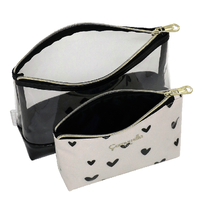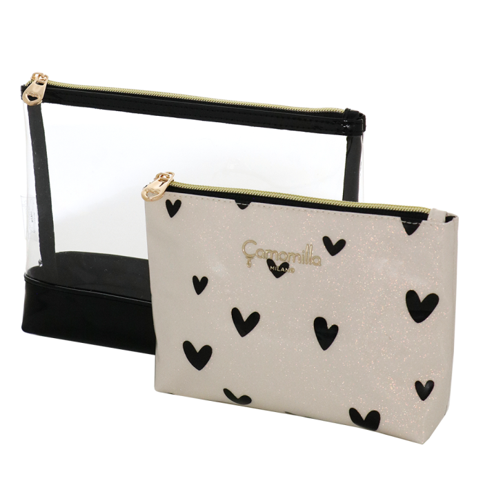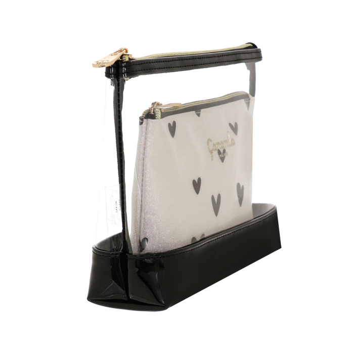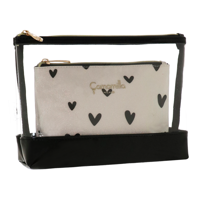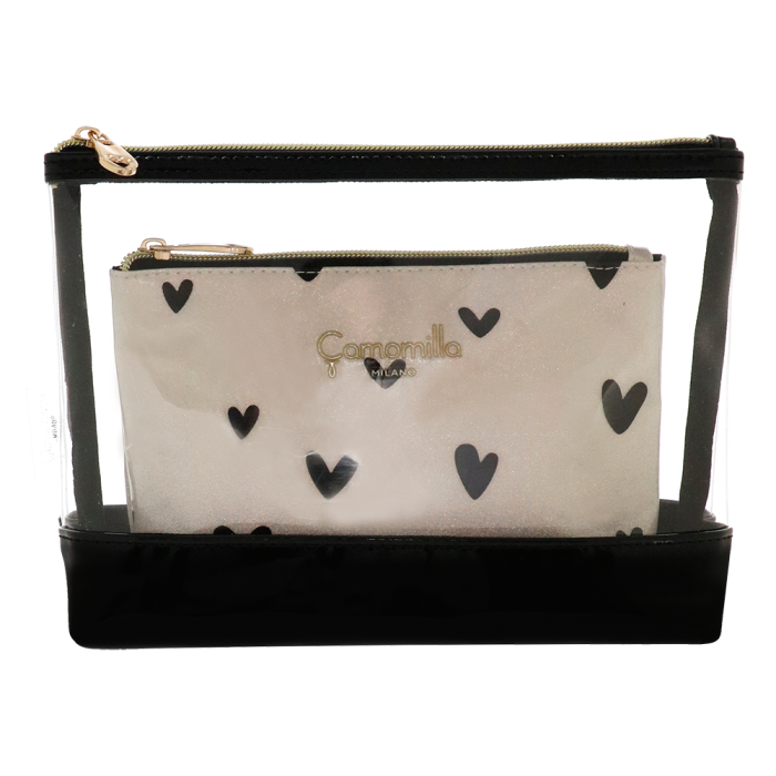 SET BUSTE LOVE ME Radoppia il glamour. Duo di pochette composto da una trousse trasparente in PVC, è adatta per solari o prodotti per capelli e una pochette non solo per trucchi e belletti ma anche documenti. Ideale per quando sarai pronta per un ritocchino. L’esterno trasparente ti aiuta a trovare rapidamente quello che stai cercando. Dimensioni : Busta esterna 17×24,5×6,5 cm, Busta interna 13×19,5×4,5 cm. Love Me è una collezione che colpisce dritto al cuore con la sua carica di energia e vivacità. Immagina un’esplosione di cuori rossi su una base glitterata dorata: una linea di beauty case e pochette che riesce a mettere di buon umore al primo sguardo. È impossibile resistere a questa ondata di allegria! Non c’è modo migliore di iniziare la giornata se non con un grande sorriso, e il tuo rituale di skincare mattutino diventa subito speciale. Ma Love Me non si ferma qui. Per chi preferisce una variante più delicata, c’è una seconda versione della linea, caratterizzata da cuori neri che si stagliano su una base glitterata bianca. Una vera e propria esplosione di dolcezza e raffinatezza che rende ogni dettaglio unico. La collezione è sviluppata in diversi formati, pensati per rispondere a ogni esigenza: dalle pochette pratiche e versatili, ideali da tenere in bagno o da portare sempre con te per un ritocco dell’ultimo minuto, ai beauty case di vari formati, tutti eleganti e funzionali.
